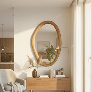 Inspired by the natural curves of stones and tree bark, this handcrafted wooden mirror brings the warmth of nature into your home with its striking organic shape. This mirror is more than just a functional object — it is a design piece that adds character and elegance to any room.