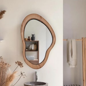 Inspired by the natural curves of stones and tree bark, this handcrafted wooden mirror brings the warmth of nature into your home with its striking organic shape. This mirror is more than just a functional object — it is a design piece that adds character and elegance to any room.