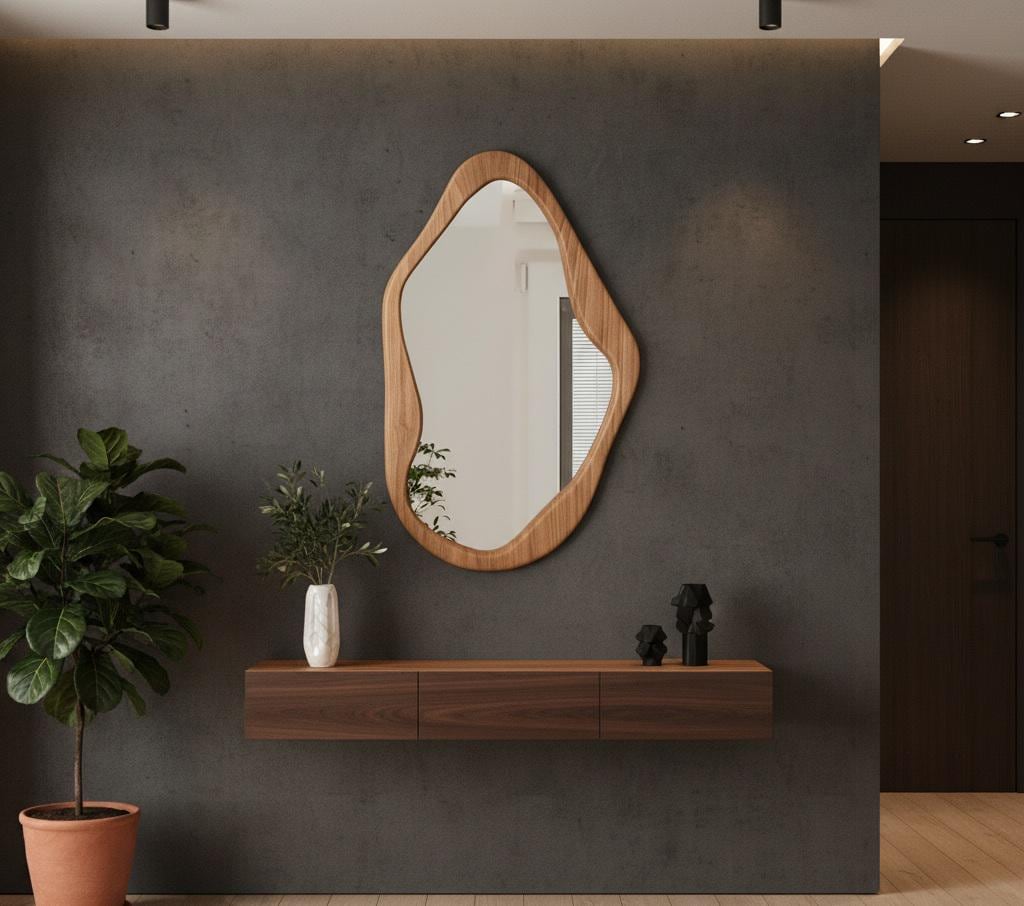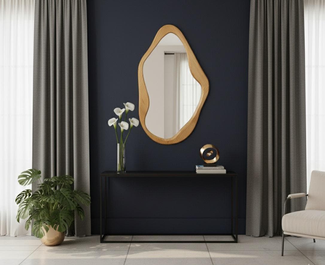 Inspired by the natural curves of stones and tree bark, this handcrafted wooden mirror brings the warmth of nature into your home with its striking organic shape. This mirror is more than just a functional object — it is a design piece that adds character and elegance to any room.